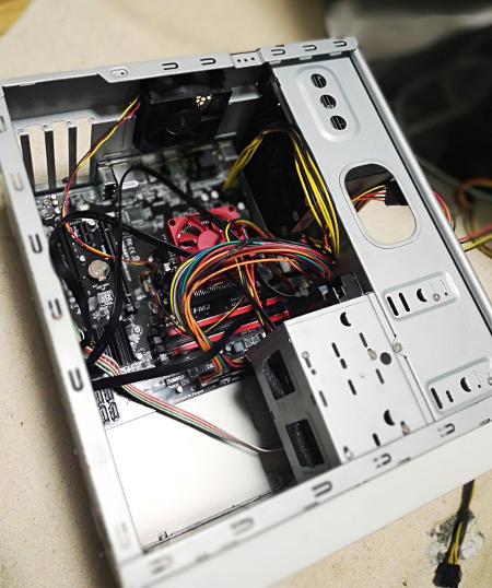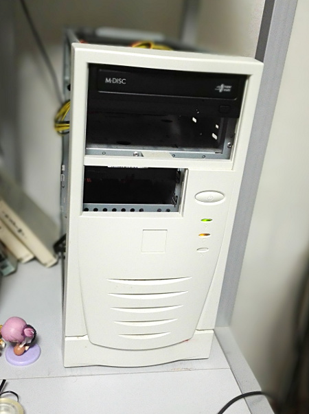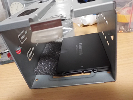 SSDは着てから気づいたのですが、2.5インチなので、この古いケースだと専用に付ける場所がなく。3.5インチベイに片方だけネジどめして、反対側の底にクッション置きました。